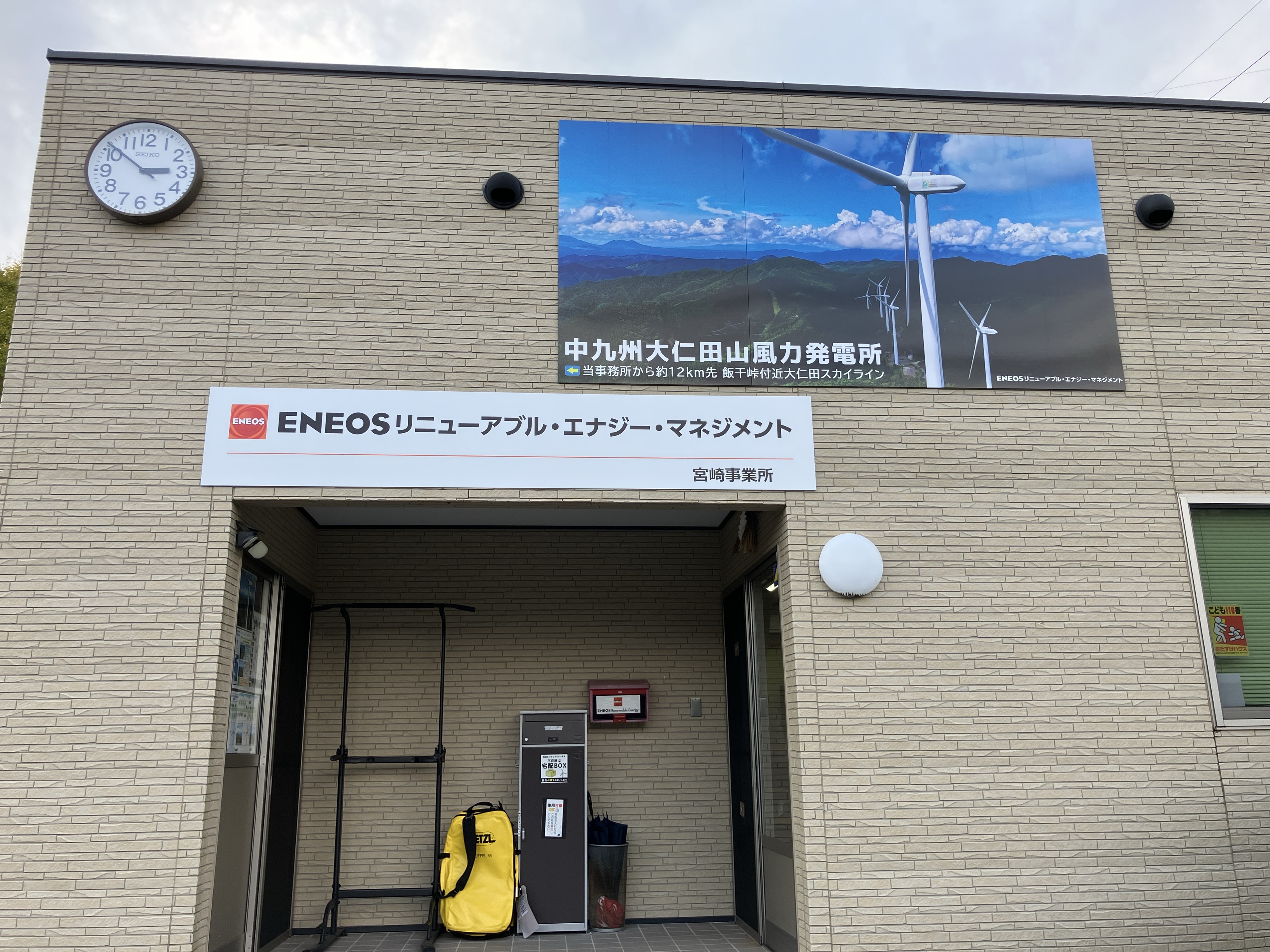 Miyazaki is located in the center of Kyushu. Eight wind turbine units (2000 kW × 8) have been installed along the ridge of Onitayama. The office members employed in this local area carry out maintenance on the wind turbines. Their work mainly involves management and maintenance of the wind farms and the provision of tours for members of the local community.